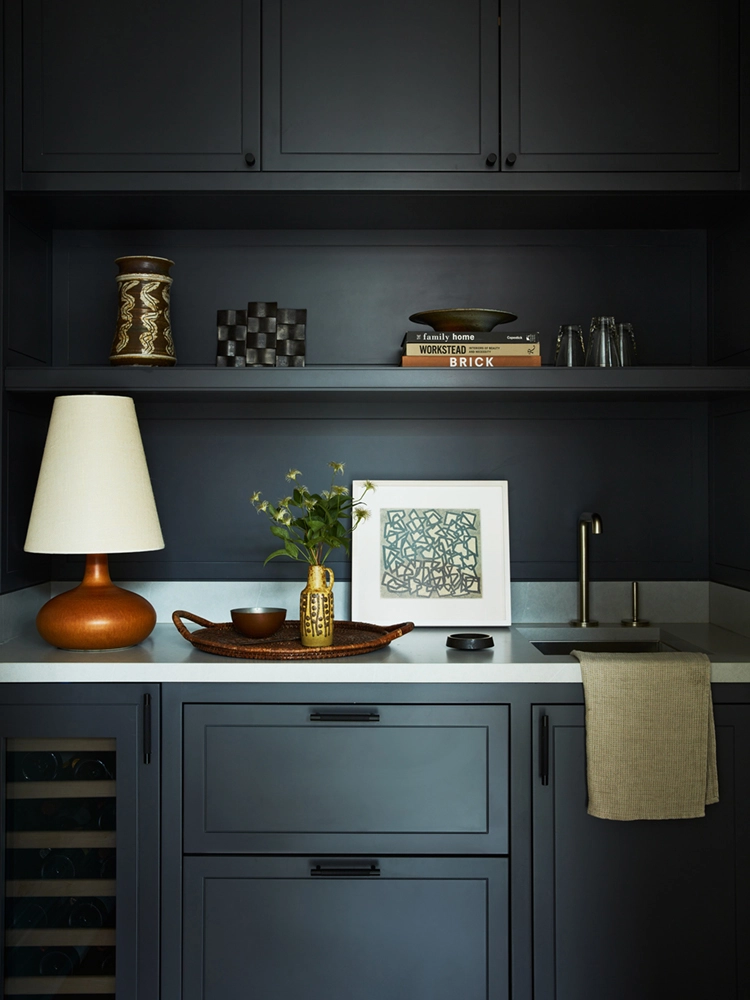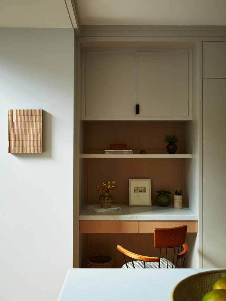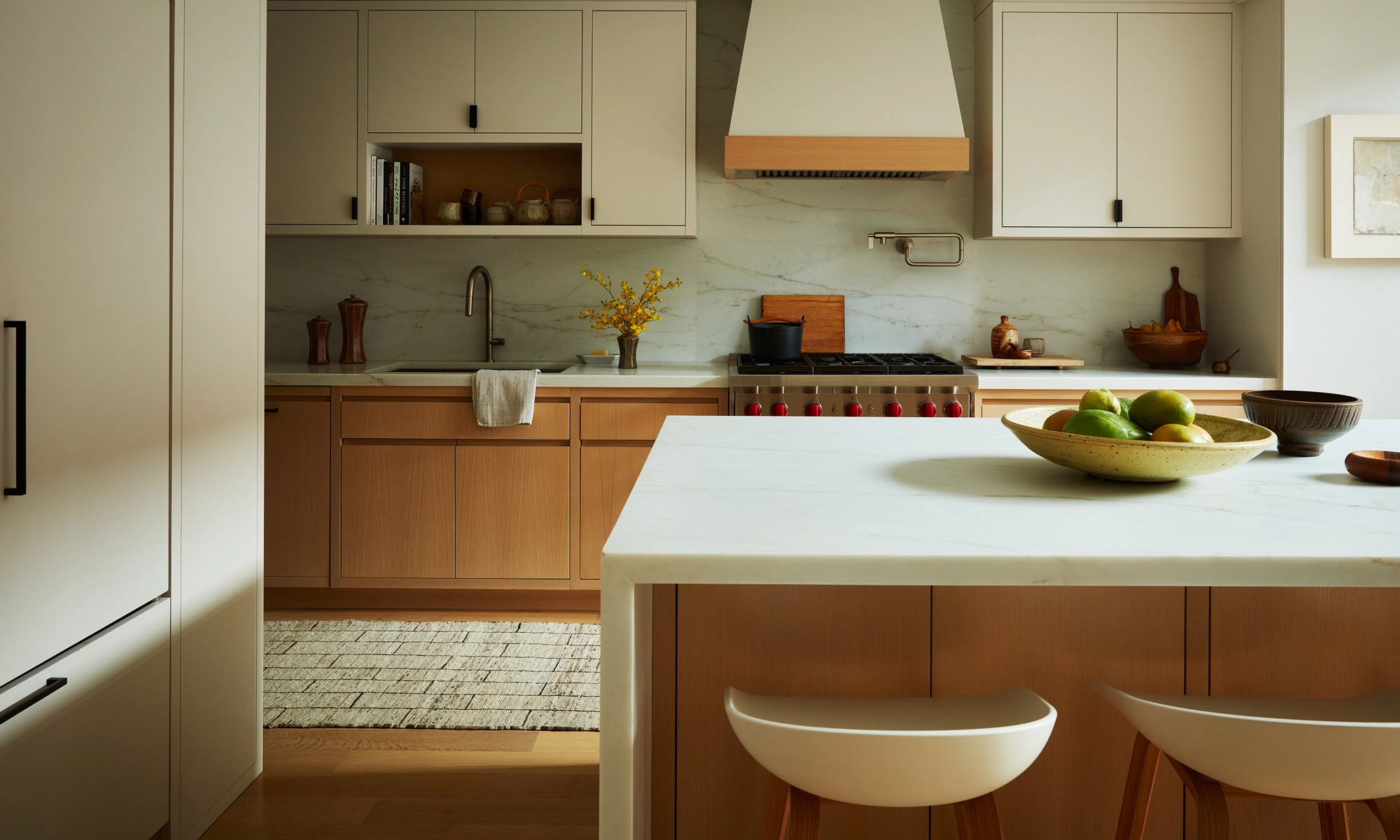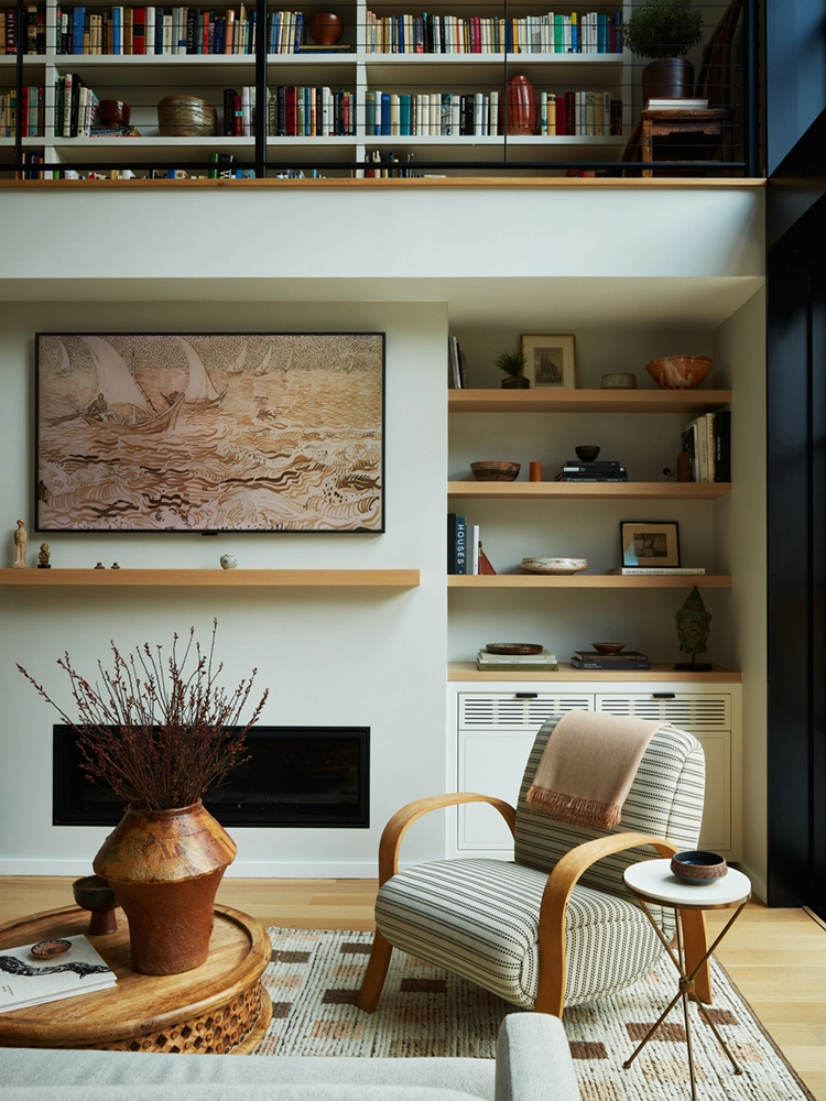 Influenced by the wife’s formative years in Europe, the design reflects a fresh, restrained palette and natural wood finishes. Avid art collectors and world travelers, their curated collection of original art, European artifacts and vintage pottery brings a distinctive personal narrative to the home.