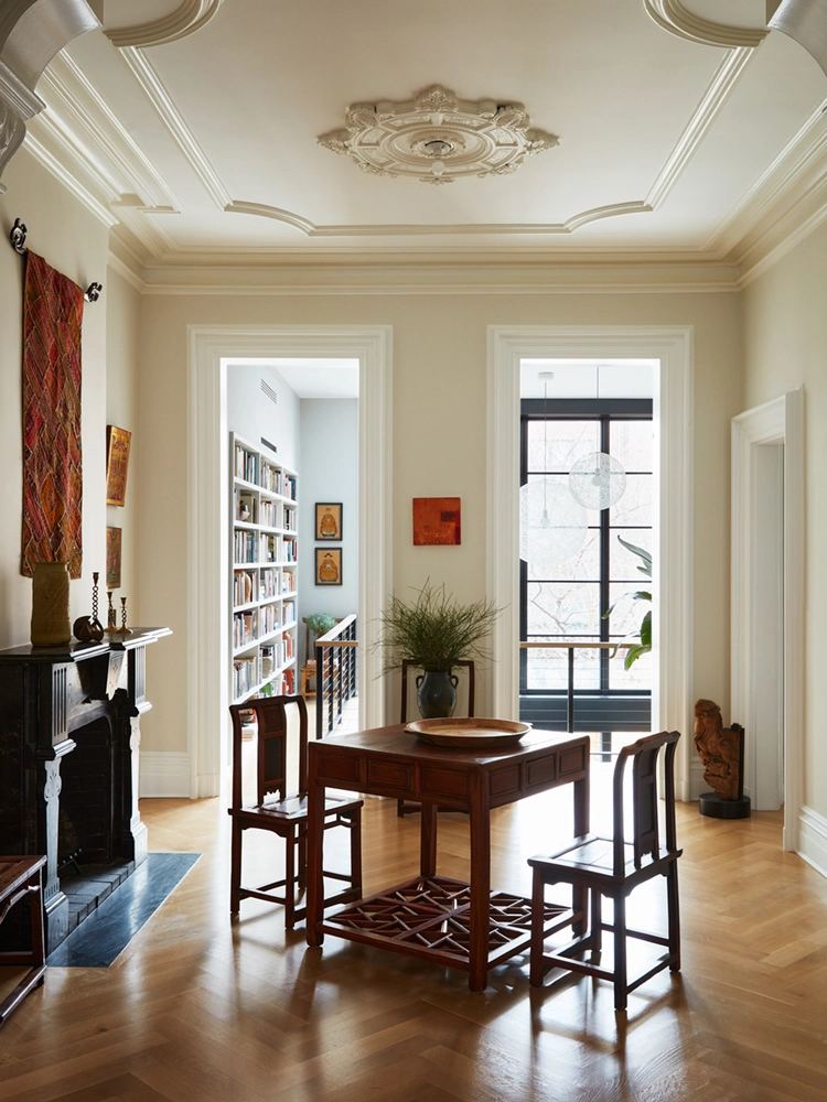 Our clients purchased their brownstone in the late 90’s. Lovers of history and the arts, the house appealed to them because of its expansive width and original details, including three working fireplaces, applied moldings, mahogany doors, original lighting fixtures, etc. all which were restored throughout the years, and which remained intact at the time of purchase.