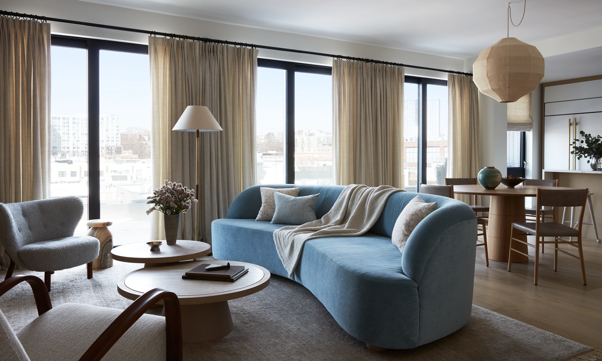 Our clients, recently retired, purchased this apt. as a pied-a-terre to be closer to their children and growing families. They were drawn to the city’s walkable nature and proximity to NYC and wanted a home that reflected a sophisticated urban aesthetic. With a fondness for blue, they welcomed a brighter palette in the main living area.
